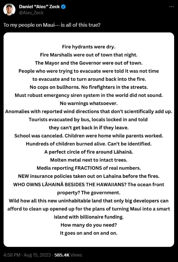 All of Hawaii will soon belong to the billionaires. Now we also know that there is a 12 mile media ban in Maui. No journalists allowed - this again infringes on 1st amendment rights. Matt Wallace asked "Why is the Maui Fires Media Ban Still in Place? What Else Are They Hiding!"