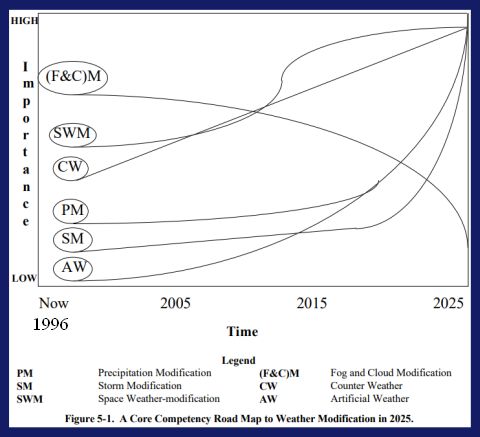 "Current technologies that will mature over the next 30 years will offer anyone who has the necessary resources the ability to modify weather patterns and their corresponding effects, at least on the local scale. Current demographic, economic, and environmental trends will create global stresses that provide the impetus necessary for many countries or groups to turn this weather-modification ability into a capability."