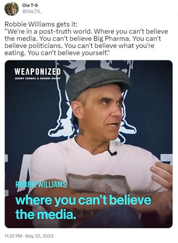 Video - Robbie Williams gets it:- "We're in a post-truth world.