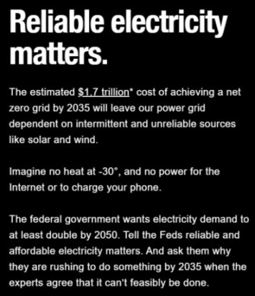 Reliable electricity matters. The estimated $1.7 trillion cost of achieving a net zero grid by 2035 will leave our power grid dependent on intermittent and unreliable sources like solar and wind. Imagine no heat at -30℃, and no power for the internet or to charge your phone. The federal government wants electricity demand to at least double by 2050. Tell the Feds reliable and affordable electricity matters. And ask them why they are rushing to do something by 2035 when the experts agree that it can't feasibly be done.